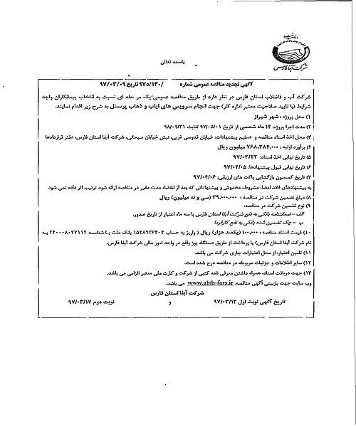 برونسپاری ارائه خدمات امداد، نگهداری و تعمیرات ، انجام خدمات پیشگیرانه شبکه های توزیع آب ، چاهها و مخازن آب و حراست فیزیکی از تاسیسات شهرستان کبودراهنگ