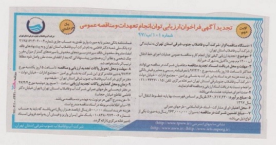 تجدید آگهی فراخوان ارزیابی توان انجام تعهدات و مناقصه عمومی شماره 101/ب/97