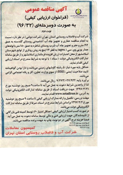 آگهی مناقصه عمومی ( فراخوان ارزیابی کیفی ) بصورت دومرحله ای نوبت دوم ( 96/32 ) شرکت آب و فاضلاب روستایی استان تهران(شرکت دولتی) در نظر دارد نسبت به انجام مناقصه حفاری و تجهیز چاه آب آشامیدنی روستای گلدسته یه عمق 192 متر و حفر و تجهیز چاه آب شرب روستای شاطره به عمق 180 متر با لوله های جدار یو پی وی سی ( UPVC ) به قطر 14 اینچ به روش روتاری از توابع شهرستان اسلامشهر از محل اعتبارات ارزش افزوده فرمانداری اسلامشهر و از طریق سامانه تدارکات الکترونیکی دولت ( ستاد ) با توجه به شرایط مندرج در اسناد ارزیابی کیفی اقدام نماید. حداقل پایه مورد نیاز: 5 رشته کاوشهای زمینی می باشد و دارا بودن گواهینامه تأییدصلاحیت ایمنی(HSE) از سوی وزارت تعاون، کار و رفاه اجتماعی الزامی می باشد. برآورد پایه: 7،473،027،922 ریال می باشد. لذا از واجدین شرایط دعوت بعمل می آید تا ساعت 9 صبح روز دوشنبه مورخ 1397/03/21 جهت دریافت اسناد از طریق سامانه تدارکات الکترونیکی دولت به آدرس: www.setadiran.ir اقدام نمایند. مهلت بررسی، تکمیل و ارائه مدارک ارزیابی کیفی تا ساعت 9 صبح روز دوشنبه مورخ 1397/04/04 بر اساس شرایط مندرج در اسناد، صرفاً از طریق سامانه تدارکات الکترونیکی دولت می باشد. در صورت کسب امتیاز ارزیابی کیفی ( حداقل امتیاز 60 ) توسط کمیته فنی بازرگانی از تأییدشدگان جهت ارزیابی فنی و مالی توسط سامانه دعوت بعمل می آید. ضمناً هزینه درج آگهی در دو نوبت چاپ بعهده برنده مناقصه می باشد. کمیسیون معاملات شرکت آب و فاضلاب روستایی استان تهران |