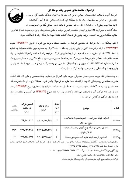 شرکت آب و فاضلاب استان همدان (سهامی خاص ) در نظر دارد با عنوان دستگاه مناقصه گزار ، پروژه های ذیل را بر اساس فهرست بهای  سال 97 ،به پیمانکارانی که دارای حداقل رتبه 5 آب و گواهینامه تایید صلاحیت ایمنی از وزارت تعاون کار و رفاه اجتماعی با سابقه انجام حداقل یک پروژه مرتبط در 5 سال گذشته به مبلغ اولیه 25% مبلغ برآوردی مناقصه و تحویل موقت یا قطعی همان پروژه و نیز دو رضایت نامه از بالاترین مقام دستگاه اجرایی در کارهای مرتبط پیشین طی 5 سال گذشته باشند(جهت دارندگان رتبه 5 )، واگذار نماید.