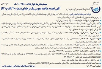 برونسپاری ارائه خدمات امداد، نگهداری و تعمیرات ، انجام خدمات پیشگیرانه شبکه های توزیع آب ، چاهها و مخازن آب و حراست فیزیکی از تاسیسات شهرستان کبودراهنگ