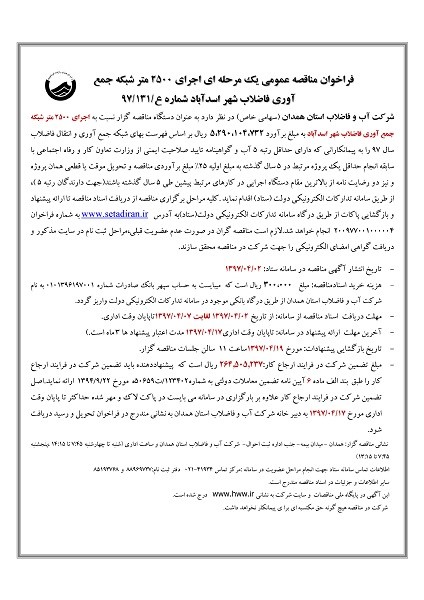 فراخوان مناقصه عمومی یک مرحله ای اجرای 2500 متر شبکه جمع آوری فاضلاب شهر اسدآباد شماره ع/131/97 شرکت آب و فاضلاب استان همدان (سهامی خاص) در نظر دارد به عنوان دستگاه مناقصه گزار نسبت به اجرای 2500 متر شبکه جمع آوری فاضلاب شهر اسدآباد به مبلغ برآورد 5،290،104،732 ریال بر اساس فهرست بهای شبکه جمع آوری و انتقال فاضلاب سال 97 را به پیمانکارانی که دارای حداقل رتبه 5 آب و گواهینامه تایید صلاحیت ایمنی از وزارت تعاون کار و رفاه اجتماعی با سابقه انجام حداقل یک پروژه مرتبط در 5 سال گذشته به مبلغ اولیه 25% مبلغ برآوردی مناقصه و تحویل موقت یا قطعی همان پروژه و نیز دو رضایت نامه از بالاترین مقام دستگاه اجرایی در کارهای مرتبط پیشین طی 5 سال گذشته باشند(جهت دارندگان رتبه 5 )، از طریق سامانه تدارکات الکترونیکی دولت (ستاد) اقدام نماید .کلیه مراحل برگزاری مناقصه از دریافت اسناد مناقصه تا ارائه پیشنهاد و بازگشایی پاکات از طریق درگاه سامانه تدارکات الکترونیکی دولت(ستاد)به آدرس www.setadiran.ir به شماره فراخوان 200977001000004 انجام خواهد شد.لازم است مناقصه گران در صورت عدم عضویت قبلی،مراحل ثبت نام در سایت مذکور و دریافت گواهی امضای الکترونیکی را جهت شرکت در مناقصه محقق سازند. - تاریخ انتشار آگهی مناقصه در سامانه ستاد: 02/04/1397 - هزینه خرید اسنادمناقصه: مبلغ 300،000 ریال است که میبایست به حساب سپهر بانک صادرات شماره 0101396197001 به نام شرکت آب و فاضلاب استان همدان از طریق درگاه بانکی موجود در سامانه تدارکات الکترونیکی دولت واریز گردد. - مهلت دریافت اسناد مناقصه از سامانه: از تاریخ 02/04/1397 لغایت 07/04/1397تاپایان وقت اداری. - آخرین مهلت ارائه پیشنهاد در سامانه: تاپایان وقت اداری17/04/1397 مدت اعتبار پیشنهاد ها 3 ماه است.) - تاریخ بازگشایی پیشنهادات: مورخ 19/04/1397ساعت 11 سالن جلسات مناقصه گزار. - مبلغ تضمین شرکت در فرایند ارجاع کار:264.505.237 ریال است که پیشنهاددهنده باید تضمین شرکت در فرایند ارجاع کار را طبق بند الف ماده 6 آیین نامه تضمین معاملات دولتی به شماره123402/ت50659ه مورخ 22/9/1394 ارائه نماید.اصل تضمین شرکت در فرایند ارجاع کار علاوه بر بارگزاری در سامانه می بایست در پاکت لاک و مهر شده حداکثر تا پایان وقت اداری مورخ 17/04/1397 به دبیر خانه شرکت آب و فاضلاب استان همدان به نشانی مندرج در فراخوان تحویل و رسید دریافت شود. نشانی مناقصه گزار: همدان - میدان بیمه- جنب اداره ثبت احوال- شرکت آب و فاضلاب استان همدان و ساعت اداری (شنبه تا چهارشنبه 7:45 تا 14:15 ،پنجشنبه 7:45 تا 13:15) اطلاعات تماس سامانه ستاد جهت انجام مراحل عضویت در سامانه :مرکز تماس 41934-021 دفتر ثبت نام:88969737 و 85193768 سایر اطلاعات و جزئیات در اسناد مناقصه مندرج است. این آگهی در پایگاه ملی مناقصات و سایت شرکت به نشانی www.hww.ir درج شده است. شرکت در مناقصه هیچ گونه حق مکتسبه ای برا ی پیمانکار نخواهد داشت. |