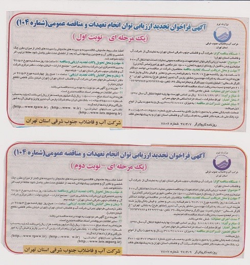 آگهی فراخوان تجدید ارزیابی توان انجام تعهدات و مناقصه عمومی(شماره 104)