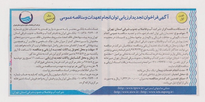 1- دستگاه مناقصه گزار: شرکت آب و فاضلاب جنوب شرقی استان تهران