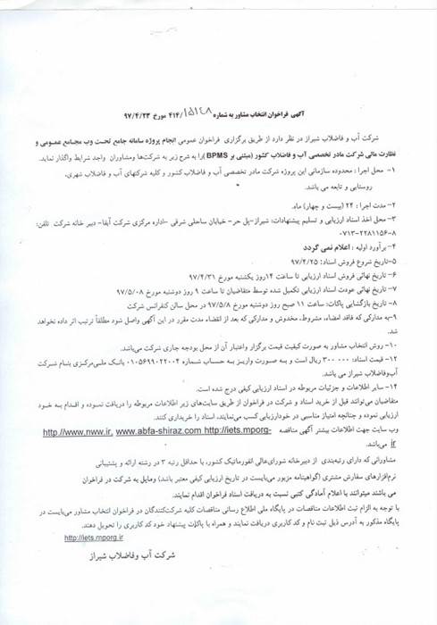 برونسپاری ارائه خدمات امداد، نگهداری و تعمیرات ، انجام خدمات پیشگیرانه شبکه های توزیع آب ، چاهها و مخازن آب و حراست فیزیکی از تاسیسات شهرستان کبودراهنگ