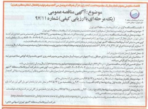 1- نام دستگاه مناقصه گزار : شرکت آب و فاضلاب منطقه3 شهر تهران.