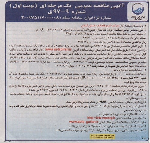| | 11 | سایت ملی مناقصات کشور: http://iets.mporg.ir سایت شرکت آب و فاضلاب شهری استان گیلان www.abfa-guilan.ir |