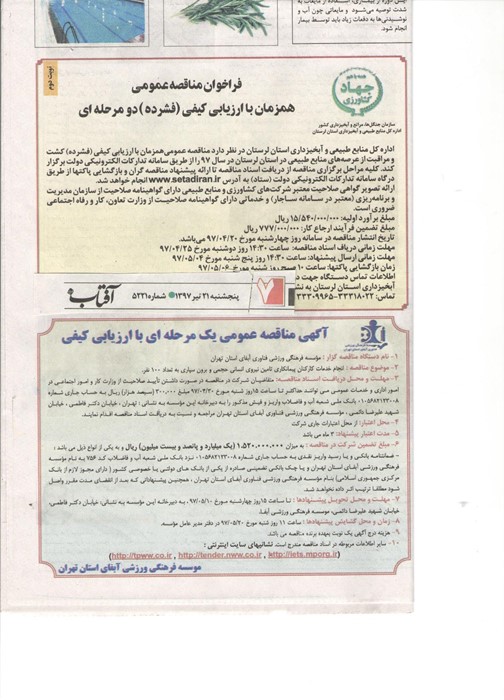 بسمه تعالی آگهی منا قصه عمومی یک مرحله ای با ارزیابی کیفی 1- نام دستگاه مناقصه گزار : مؤسسه فرهنگی ورزشی فناوری آبفای استان تهران 2- موضوع مناقصه : انجام خدمات کارکنان پیمانکاری تامین نیروی انسانی حجمی و برون سپاری به تعداد 100 نفر. 3- مهلت و محل دریافت اسناد مناقصه: متقاضیان شرکت در مناقصه در صورت داشتن تأیید صلاحیت از وزارت کار و امور اجتماعی در امور اداری و خدمات عمومی می توانند حداکثر تا ساعت 15روز شنبه مورخ 30/04/97 مبلغ 000/300(سیصد هزار) ریال به حساب جاری شماره 0105682123008 بانک ملی شعبه آب و فاضلاب واریز و فیش مذکور را به دبیرخانه این مؤسسه به نشانی: تهران، خیابان دکتر فاطمی، خیابان شهید علیرضا دائمی، مؤسسه فرهنگی ورزشی فناوری آبفای استان تهران مراجعه و نسبت به دریافت اسناد مناقصه اقدام نمایند. 4- محل اعتبار: از محل اعتبارات جاری شرکت 5- مدت اعتبار پیشنهاد: 3 ماه می باشد 6- مبلغ تضمین شرکت در مناقصه : به میزان000/000/520/1(یک میلیارد و پانصد و بیست میلیون) ریال و به یکی از انواع ذیل می باشد : - ضمانتنامه بانکی و یا رسید واریز نقدی به حساب جاری شماره 0105682123008 نزد بانک ملی شعبه آب و فاضلاب کد 756 به نام مؤسسه فرهنگی ورزشی آبفای استان تهران و یا چک بانکی تضمینی صادره از یکی از بانک های دولتی یا خصوصی کشور ( دارای مجوز لازم از بانک مرکزی جمهوری اسلامی) بنام مؤسسه فرهنگی ورزشی فناوری آبفای استان تهران ، همچنین پیشنهاداتی که بعد از انقضای مدت مقرر واصل شود مطلقاً ترتیب اثر داده نخواهد شد. . 6-مهلت و محل تحویل پیشنهادها : تا ساعت15روز چهارشنبه مورخ10/05/97، به دبیرخانه این مؤسسه به نشانی: خیابان دکتر فاطمی، خیابان شهید علیرضا دائمی، موسسه فرهنگی ورزشی آبفا. 7-زمان و محل گشایش پیشنهادها : ساعت11روز شنبه مورخ 20/05/97 در دفتر مدیرعامل مؤسسه. 8-هزینه درج آگهی یک نوبت بعهده برنده مناقصه می باشد. 9-سایر اطلاعات مربوطه در اسناد مناقصه مندرج است. نشانیهای سایت اینترنتی : http://iets.mporg.ir ) و http://tender.nww.co.ir و http://www.tpww.co.ir) مؤسسه فرهنگی ورزشی آبفای استان تهران |