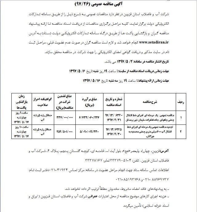 برونسپاری ارائه خدمات امداد، نگهداری و تعمیرات ، انجام خدمات پیشگیرانه شبکه های توزیع آب ، چاهها و مخازن آب و حراست فیزیکی از تاسیسات شهرستان کبودراهنگ
