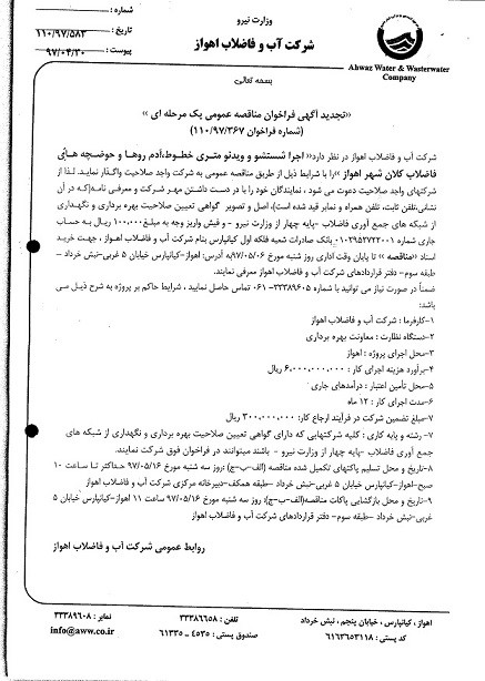 ‹‹تجدید آگهی فراخوان مناقصه عمومی یک مرحله ای ›› (شماره فراخوان 367/97/110) شرکت آب و فاضلاب اهواز در نظر دارد‹‹ اجرا شستشو و ویدئو متری خطوط،آدم روها و حوضچه های فاضلاب کلان شهر اهواز ››را با شرایط ذیل از طریق مناقصه عمومی به شرکت واجد صلاحیت واگذار نماید. لذا از شرکتهای واجد صلاحیت دعوت می شود ، نمایندگان خود را با در دست داشتن مهر شرکت و معرفی نامه(که در آن نشانی،تلفن ثابت، تلفن همراه و نمابر قید شده است)، اصل و تصویر گواهی تعیین صلاحیت بهره برداری و نگهداری از شبکه های جمع آوری فاضلاب -پایه چهار از وزارت نیرو - و فیش واریز وجه به مبلغ100،000 ریال به حساب جاری شماره 0102952722001 بانک صادرات شعبه فلکه اول کیانپارس بنام شرکت آب و فاضلاب اهواز ، جهت خرید اسناد ‹‹مناقصه ›› تا پایان وقت اداری روز شنبه مورخ 06/05/97به آدرس: اهواز-کیانپارس خیابان 5 غربی-نبش خرداد –طبقه سوم- دفتر قراردادهای شرکت آب و فاضلاب اهواز معرفی نمایند. ضمناً در صورت نیاز می توانید با شماره 33389605- 061 تماس حاصل نمایید ، شرایط حاکم بر پروژه به شرح ذیل می باشد: 1-کارفرما : شرکت آب و فاضلاب اهواز 2-دستگاه نظارت : معاونت بهره برداری 3-محل اجرای پروژه : اهواز 4-برآورد هزینه اجرای کار : 6،000،000،000 ریال 5-محل تأمین اعتبار : درآمدهای جاری 6-مدت اجرای کار : 12 ماه 7-مبلغ تضمین شرکت در فرآیند ارجاع کار: 300،000،000 ریال 7- رشته و پایه کاری : کلیه شرکتهایی که دارای گواهی تعیین صلاحیت بهره برداری و نگهداری از شبکه های جمع آوری فاضلاب -پایه چهار از وزارت نیرو - باشند میتوانند در فراخوان فوق شرکت نمایند. 8-تاریخ و محل تسلیم پاکتهای تکمیل شده مناقصه (الف-ب-ج) :روز سه شنبه مورخ 16/05/97 حداکثر تا ساعت 10 صبح-اهواز-کیانپارس خیابان 5 غربی-نبش خرداد –طبقه همکف-دبیرخانه مرکزی شرکت آب و فاضلاب اهواز 9-تاریخ و محل بازگشایی پاکات مناقصه(الف-ب-ج): روز سه شنبه مورخ 16/05/97 ساعت 11 اهواز-کیانپارس خیابان 5 غربی-نبش خرداد –طبقه سوم- دفتر قراردادهای شرکت آب و فاضلاب اهواز روابط عمومی شرکت آب و فاضلاب اهواز |