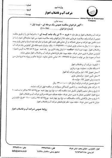 ‹‹ آگهی فراخوان مناقصه عمومی یک مرحله ای – نوبت اول ›› (شماره فراخوان110/97/592) شرکت آب و فاضلاب اهواز در نظر دارد ‹‹ خرید 200 تن پک جامد کیسه ای ›› با شرایط ذیل را از طریق مناقصه عمومی از شرکت واجد صلاحیت خریداری نماید. لذا از شرکتهای واجد صلاحیت دعوت می شود ،نمایندگان خود را با در دست داشتن مهر شرکت و معرفی نامه(که در آن نشانی،تلفن ثابت، تلفن همراه و نمابر قید شده است)، و فیش واریز وجه به مبلغ100،000 ریال به حساب جاری شماره 0102952722001 بانک صادرات شعبه فلکه اول کیانپارس بنام شرکت آب و فاضلاب اهواز ، جهت خرید اسناد ‹‹مناقصه ›› تا پایان وقت اداری روز یک شنبه مورخ 07/05/97 به آدرس: اهواز-کیانپارس خیابان 5 غربی-نبش خرداد –طبقه سوم- دفتر قراردادهای شرکت آب و فاضلاب اهواز معرفی نمایند. ضمناً در صورت نیاز می توانید با شماره 33389605- 061 تماس حاصل نمایید ، شرایط حاکم بر پروژه به شرح ذیل می باشد: 1-کارفرما : شرکت آب و فاضلاب اهواز 2-دستگاه نظارت : معاونت بهره برداری 3-محل تحویل کالا : انبار مرکزی شرکت آبفا اهواز 4-محل تأمین اعتبار : درآمدهای جاری 5-مدت زمان تحویل کالا : دوازده ماه 6-مبلغ تضمین شرکت در فرآیند ارجاع کار: 640،000،000 ریال 7- شرکت های تولیدکننده و یا تامین کنندگان میتوانند در مناقصه فوق شرکت نمایند. 8-تاریخ و محل تسلیم پاکتهای تکمیل شده مناقصه (الف-ب-ج) :روز چهار شنبه مورخ17/05/97 حداکثر تا ساعت 10 صبح-اهواز-کیانپارس خیابان 5 غربی-نبش خرداد –طبقه همکف-دبیرخانه مرکزی شرکت آب و فاضلاب اهواز 9-تاریخ و محل بازگشایی پاکات مناقصه(الف-ب-ج): روز چهار شنبه مورخ17/05/97 ساعت 11:00 -اهواز-کیانپارس خیابان 5 غربی-نبش خرداد –طبقه سوم- دفتر قراردادهای شرکت آب و فاضلاب اهواز روابط عمومی شرکت آب و فاضلاب اهواز |