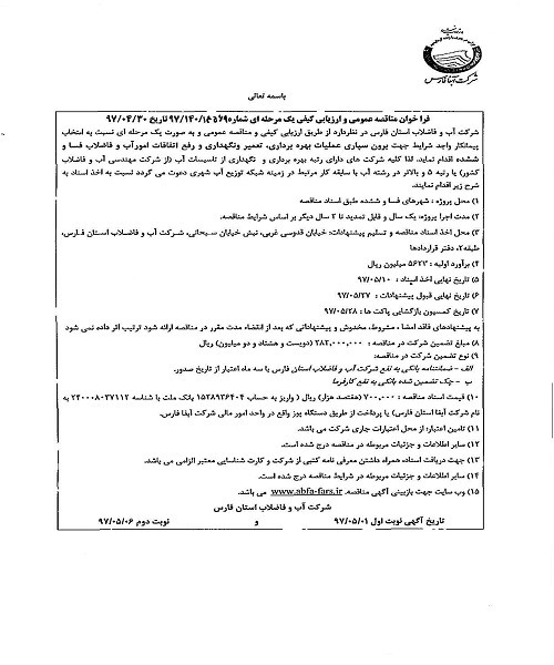 برون سپاری عملیات بهره برداری ، تعمیر و نگهداری و رفع اتفاقات امور آب و فاضلاب فسا و ششده