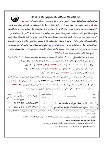 شرکت آب و فاضلاب استان همدان (سهامی خاص) در نظر دارد به عنوان دستگاه مناقصه گزار اجرای پروژه های ذیل بر اساس فهرست بهای شبکه جمع آوری و انتقال فاضلاب  سال 97 را به پیمانکارانی که دارای حداقل رتبه 5 آب و گواهینامه تایید صلاحیت ایمنی از وزارت تعاون کار و رفاه اجتماعی با سابقه انجام حداقل یک پروژه مرتبط در 5 سال گذشته به مبلغ اولیه 25% مبلغ برآوردی مناقصه و تحویل موقت یا قطعی همان پروژه و نیز دو رضایت نامه از بالاترین مقام دستگاه اجرایی در کارهای مرتبط پیشین طی 5 سال گذشته باشند(جهت دارندگان رتبه 5 )، از طریق سامانه تدارکات الکترونیکی دولت (ستاد) واگذارنماید .کلیه مراحل برگزاری مناقصه از دریافت اسناد مناقصه تا ارائه پیشنهاد و بازگشایی پاکات از طریق درگاه سامانه تدارکات الکترونیکی دولت(ستاد)به آدرس www.setadiran.ir  انجام خواهد شد.لازم است مناقصه گران در صورت عدم عضویت قبلی،مراحل ثبت نام در سایت مذکور و دریافت گواهی امضای الکترونیکی را جهت شرکت در مناقصه محقق سازند.