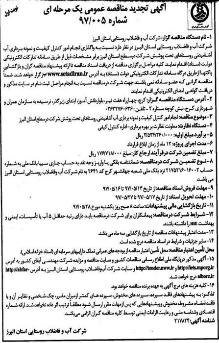 واگذاری انجام امور کنترل کیفیت و نمونه برداری آب آشامیدنی روستاهای تحت پوشش شرکت در سطح استان البرز