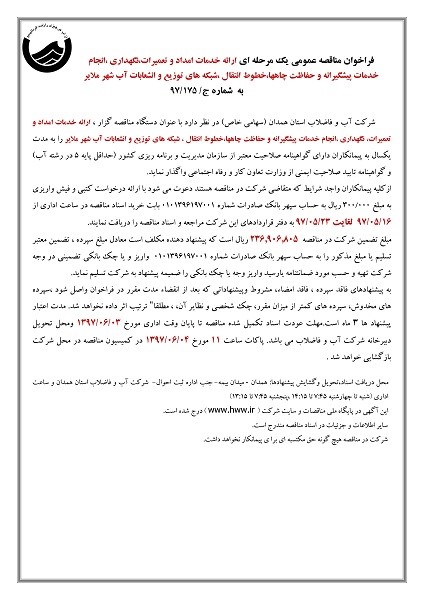 فراخوان مناقصه عمومی یک مرحله ای ارائه خدمات امداد و تعمیرات،نگهداری ،انجام خدمات پیشگیرانه و حفاظت چاهها،خطوط انتقال ،شبکه های توزیع و انشعابات آب شهر ملایر