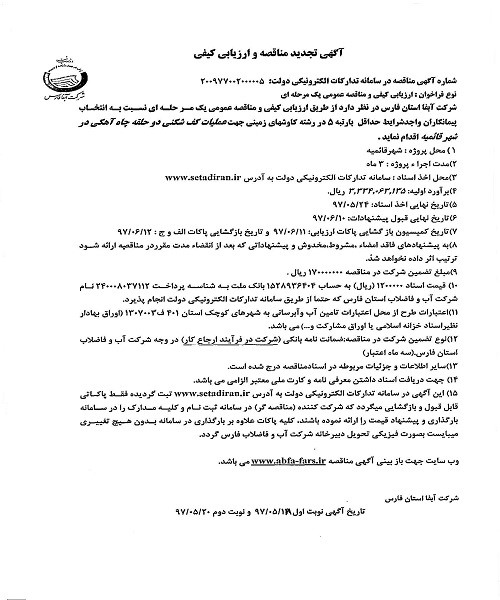 برونسپاری ارائه خدمات امداد، نگهداری و تعمیرات ، انجام خدمات پیشگیرانه شبکه های توزیع آب ، چاهها و مخازن آب و حراست فیزیکی از تاسیسات شهرستان کبودراهنگ