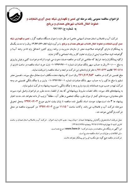 فراخوان مناقصه عمومی یک مرحله ای تعمیر و نگهداری شبکه جمع آوری،انشعابات و خطوط انتقال فاضلاب شهرهای همدان و مریانج به شماره ج/ 176/97 شرکت آب و فاضلاب استان همدان (سهامی خاص) در نظر دارد با عنوان دستگاه مناقصه گزار ، تعمیر و نگهداری شبکه جمع آوری،انشعابات و خطوط انتقال فاضلاب شهرهای همدان و مریانج با برآورد اولیه13.971.660.881 ریال را به مدت یکسال به پیمانکاران دارای گواهینامه صلاحیت معتبر از سازمان مدیریت و برنامه ریزی کشور (حداقل پایه 5 در رشته آب) و گواهینامه تایید صلاحیت ایمنی از وزارت تعاون کار و رفاه اجتماعی واگذار نماید. ازکلیه پیمانکاران واجد شرایط که متقاضی شرکت در مناقصه هستند دعوت می شود با ارائه درخواست کتبی و فیش واریزی به مبلغ 000/300 ریال به حساب سپهر بانک صادرات شماره 0101396197001 بابت خرید اسناد مناقصه در ساعت اداری از 18/05/97 لغایت 24/05/97 به دفتر قراردادهای این شرکت مراجعه و اسناد مناقصه را دریافت نمایند. مبلغ تضمین شرکت در مناقصه 261.914.983 ریال است که پیشنهاد دهنده مکلف است معادل مبلغ سپرده ، تضمین معتبر تسلیم یا مبلغ مذکور را به حساب سپهر بانک صادرات شماره 0101396197001 واریز و یا چک بانکی تضمینی در وجه شرکت تهیه و حسب مورد ضمانتنامه یارسید واریز وجه یا چک بانکی را ضمیمه پیشنهاد به شرکت تسلیم نماید. به پیشنهادهای فاقد سپرده ، فاقد امضاء، مشروط وپیشنهاداتی که بعد از انقضاء مدت مقرر در فراخوان واصل شود ،سپرده های مخدوش، سپرده های کمتر از میزان مقرر، چک شخصی و نظایر آن، ، مطلقا" ترتیب اثر داده نخواهد شد. مدت اعتبار پیشنهاد ها 3 ماه است.مهلت عودت اسناد تکمیل شده مناقصه تا پایان وقت اداری مورخ 03/06/1397 ومحل تحویل دبیرخانه شرکت آب و فاضلاب می باشد. پاکات ساعت " 11:15 مورخ 04/06/1397 در کمیسیون مناقصه در محل شرکت بازگشایی خواهد شد . محل دریافت اسناد،تحویل وگشایش پیشنهادها: همدان - میدان بیمه- جنب اداره ثبت احوال- شرکت آب و فاضلاب استان همدان و ساعت اداری (شنبه تا چهارشنبه 7:45 تا 14:15 ،پنجشنبه 7:45 تا 13:15) این آگهی در پایگاه ملی مناقصات و سایت شرکت (www.hww.ir ) درج شده است. سایر اطلاعات و جزئیات در اسناد مناقصه مندرج است. شرکت در مناقصه هیچ گونه حق مکتسبه ای برا ی پیمانکار نخواهد داشت |