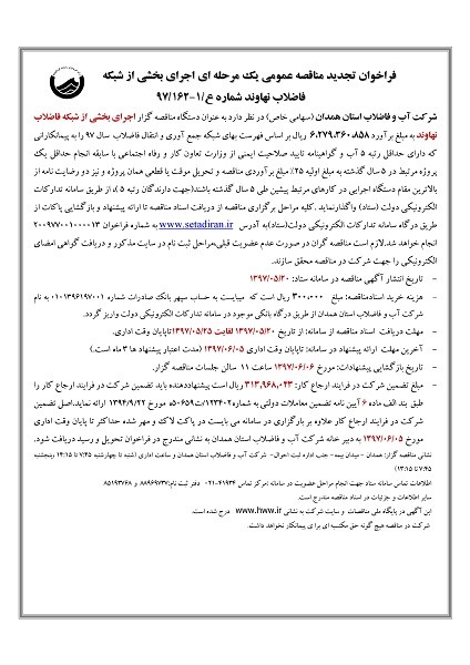 فراخوان تجدید مناقصه عمومی یک مرحله ای اجرای بخشی از شبکه فاضلاب نهاوند شماره ع/1-162/97 شرکت آب و فاضلاب استان همدان (سهامی خاص) در نظر دارد به عنوان دستگاه مناقصه گزار اجرای بخشی از شبکه فاضلاب نهاوند به مبلغ برآورد 6،279،360،858 ریال بر اساس فهرست بهای شبکه جمع آوری و انتقال فاضلاب سال 97 را به پیمانکارانی که دارای حداقل رتبه 5 آب و گواهینامه تایید صلاحیت ایمنی از وزارت تعاون کار و رفاه اجتماعی با سابقه انجام حداقل یک پروژه مرتبط در 5 سال گذشته به مبلغ اولیه 25% مبلغ برآوردی مناقصه و تحویل موقت یا قطعی همان پروژه و نیز دو رضایت نامه از بالاترین مقام دستگاه اجرایی در کارهای مرتبط پیشین طی 5 سال گذشته باشند(جهت دارندگان رتبه 5 )، از طریق سامانه تدارکات الکترونیکی دولت (ستاد) واگذارنماید .کلیه مراحل برگزاری مناقصه از دریافت اسناد مناقصه تا ارائه پیشنهاد و بازگشایی پاکات از طریق درگاه سامانه تدارکات الکترونیکی دولت(ستاد)به آدرس www.setadiran.ir به شماره فراخوان 200977001000013 انجام خواهد شد.لازم است مناقصه گران در صورت عدم عضویت قبلی،مراحل ثبت نام در سایت مذکور و دریافت گواهی امضای الکترونیکی را جهت شرکت در مناقصه محقق سازند. - تاریخ انتشار آگهی مناقصه در سامانه ستاد: 20/05/1397 - هزینه خرید اسنادمناقصه: مبلغ 300،000 ریال است که میبایست به حساب سپهر بانک صادرات شماره 0101396197001 به نام شرکت آب و فاضلاب استان همدان از طریق درگاه بانکی موجود در سامانه تدارکات الکترونیکی دولت واریز گردد. - مهلت دریافت اسناد مناقصه از سامانه: از تاریخ 20/05/1397 لغایت 25/05/1397تاپایان وقت اداری. - آخرین مهلت ارائه پیشنهاد در سامانه: تاپایان وقت اداری 05/06/1397 (مدت اعتبار پیشنهاد ها 3 ماه است.) - تاریخ بازگشایی پیشنهادات: مورخ 06/06/1397 ساعت 11 سالن جلسات مناقصه گزار.