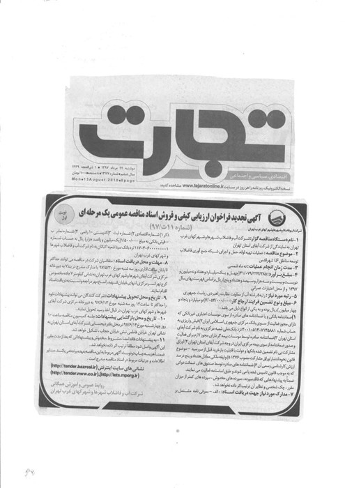 برونسپاری ارائه خدمات امداد، نگهداری و تعمیرات ، انجام خدمات پیشگیرانه شبکه های توزیع آب ، چاهها و مخازن آب و حراست فیزیکی از تاسیسات شهرستان کبودراهنگ