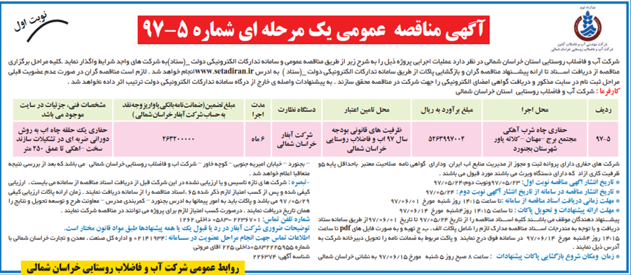 آگهی مناقصه عمومی یک مرحله ای شماره 97-5(نوبت اول)