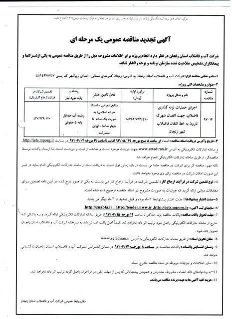 تجدید مناقصه عمومی یک مرحله ای" اجرای عملیات لوله گذاری فاضلاب جهت اتصال شهرک نارون به خط انتقال فاضلاب شهر زنجان به شماره 14-97"