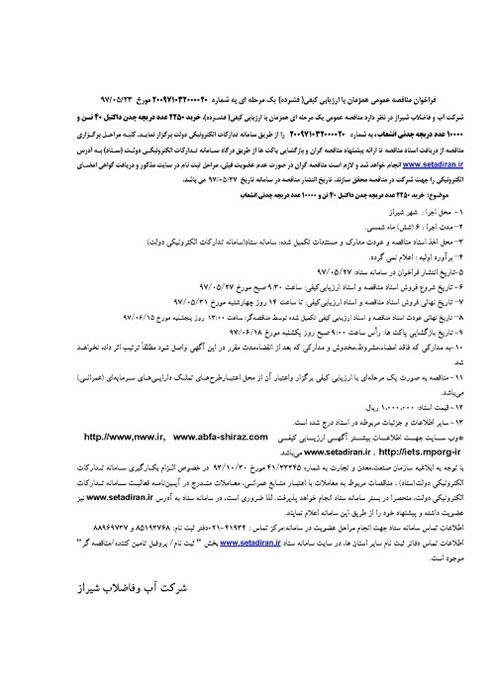 برونسپاری ارائه خدمات امداد، نگهداری و تعمیرات ، انجام خدمات پیشگیرانه شبکه های توزیع آب ، چاهها و مخازن آب و حراست فیزیکی از تاسیسات شهرستان کبودراهنگ