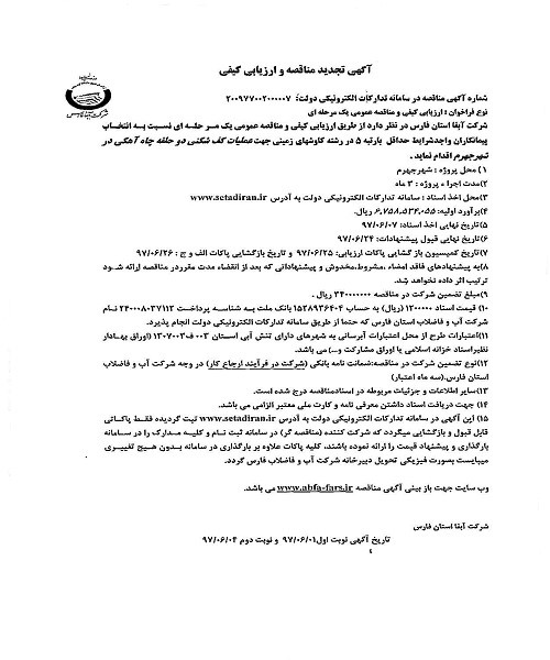 برونسپاری ارائه خدمات امداد، نگهداری و تعمیرات ، انجام خدمات پیشگیرانه شبکه های توزیع آب ، چاهها و مخازن آب و حراست فیزیکی از تاسیسات شهرستان کبودراهنگ