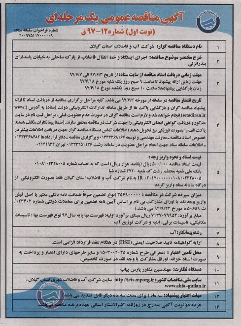 | | 1 | نام دستگاه مناقصه گزار : شرکت آب و فاضلاب استان گیلان |
