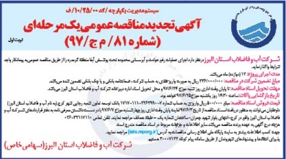 برونسپاری ارائه خدمات امداد، نگهداری و تعمیرات ، انجام خدمات پیشگیرانه شبکه های توزیع آب ، چاهها و مخازن آب و حراست فیزیکی از تاسیسات شهرستان کبودراهنگ