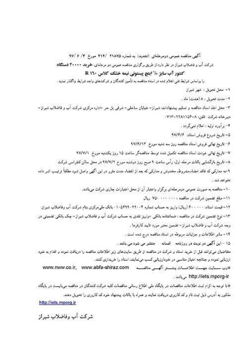 برونسپاری ارائه خدمات امداد، نگهداری و تعمیرات ، انجام خدمات پیشگیرانه شبکه های توزیع آب ، چاهها و مخازن آب و حراست فیزیکی از تاسیسات شهرستان کبودراهنگ