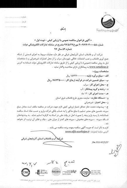 باسمه تعالی « آگهی فراخوان مناقصه عمومی با ارزیابی کیفی – نوبت اول » شماره 200971403000055 مورخ27/5/97 مندرج در سامانه تدارکات الکترونیکی دولت شماره 59 سال 97 شرکت آب و فاضلاب استان آذربایجان شرقی در نظر دارد عملیات مربوط به اجرای قسمتی از شبکه جمع آوری فاضلاب و نصب انشعابات خانگی شهرستان سراب را از محل اعتبارات غیرعمرانی و با مشخصات ذیل به روش مناقصه (عمومی) با ارزیابی کیفی را از طریق سامانه تدارکات الکترونیکی دولت (ستاد) به آدرس www.setadiran.ir به پیمانکاران دارای صلاحیت واگذار نماید . مشخصات پروژه : الف – مبلغ برآورد اولیه : 15747000000 ریال ب – مبلغ تضمین شرکت در فرآیند ارجاع کار : 787350000 ریال ج – محل اجرای کار : سراب د – رشته و گروه پیمانکار : آب هـ – مدت اجرای کار : 12 ماه و – دستگاه نظارت : نماینده مجری طرح فاضلاب شرق استان ز- محل اعتبار : غیرعمرانی ح – پیشنهاده دهنده حائز حداقل امتیاز ارزیابی کیفی لازم جهت شرکت در مناقصه مکلف است معادل مبلغ سپرده ،تضمین های معتبر تسلیم یا مبلغ مذکور را به حساب بانکی شرکت واریز و حسب مفاد اسناد مناقصه ضمانتنامه یا رسید واریز وجه را بصورت اصل در وقت مقرر در اسناد به کارفرما تسلیم نماید . به پیشنهادهای فـــاقد سپرده ، سپرده های مخدوش ، سپرده های کمتر از میزان مقرر ، چک و نظایر آن ترتیب اثر نخواهد شد . لازم به ذکر است که هزینه آگهی مناقصه بعهده برنده مناقصه می باشد . آدرس سایت اینترنت : www.abfa-azarbaijan.ir | | شرکت آب و فاضلاب استان آذربایجان شرقی | Am.5513-97/5/27 |
