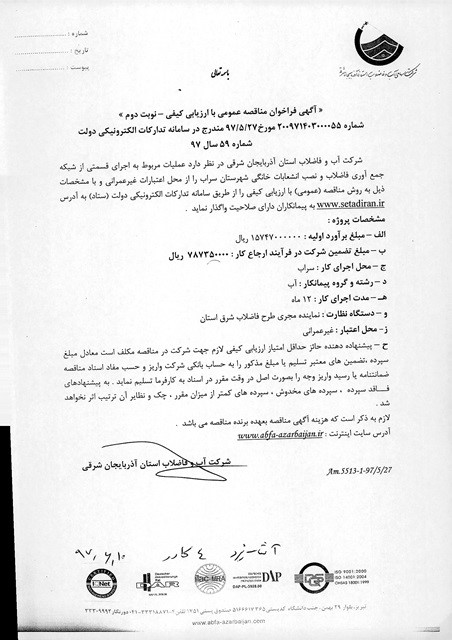 باسمه تعالی « آگهی فراخوان مناقصه عمومی با ارزیابی کیفی – نوبت دوم » شماره 200971403000055 مورخ27/5/97 مندرج در سامانه تدارکات الکترونیکی دولت شماره 59 سال 97 شرکت آب و فاضلاب استان آذربایجان شرقی در نظر دارد عملیات مربوط به اجرای قسمتی از شبکه جمع آوری فاضلاب و نصب انشعابات خانگی شهرستان سراب را از محل اعتبارات غیرعمرانی و با مشخصات ذیل به روش مناقصه (عمومی) با ارزیابی کیفی را از طریق سامانه تدارکات الکترونیکی دولت (ستاد) به آدرس www.setadiran.ir به پیمانکاران دارای صلاحیت واگذار نماید . مشخصات پروژه : الف – مبلغ برآورد اولیه : 15747000000 ریال ب – مبلغ تضمین شرکت در فرآیند ارجاع کار : 787350000 ریال ج – محل اجرای کار : سراب د – رشته و گروه پیمانکار : آب هـ – مدت اجرای کار : 12 ماه و – دستگاه نظارت : نماینده مجری طرح فاضلاب شرق استان ز- محل اعتبار : غیرعمرانی ح – پیشنهاده دهنده حائز حداقل امتیاز ارزیابی کیفی لازم جهت شرکت در مناقصه مکلف است معادل مبلغ سپرده ،تضمین های معتبر تسلیم یا مبلغ مذکور را به حساب بانکی شرکت واریز و حسب مفاد اسناد مناقصه ضمانتنامه یا رسید واریز وجه را بصورت اصل در وقت مقرر در اسناد به کارفرما تسلیم نماید . به پیشنهادهای فـــاقد سپرده ، سپرده های مخدوش ، سپرده های کمتر از میزان مقرر ، چک و نظایر آن ترتیب اثر نخواهد شد . لازم به ذکر است که هزینه آگهی مناقصه بعهده برنده مناقصه می باشد . آدرس سایت اینترنت : www.abfa-azarbaijan.ir | | شرکت آب و فاضلاب استان آذربایجان شرقی | Am.5513-97/5/27 |