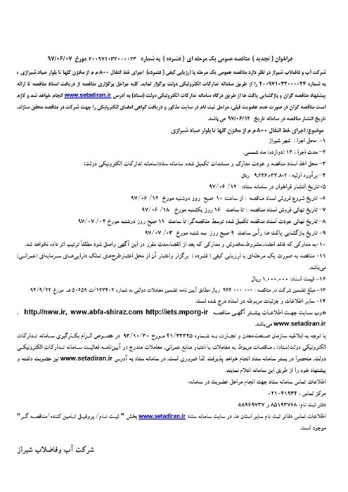 برونسپاری ارائه خدمات امداد، نگهداری و تعمیرات ، انجام خدمات پیشگیرانه شبکه های توزیع آب ، چاهها و مخازن آب و حراست فیزیکی از تاسیسات شهرستان کبودراهنگ
