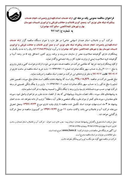 فراخوان مناقصه عمومی یک مرحله ای ارائه خدمات امداد،نگهداری وتعمیرات ،انجام خدمات پیشگیرانه شبکه های توزیع آب وجمع آوری فاضلاب و حفاظت فیزیکی و اپراتوری تاسیسات شهرستان بهار و شهرهای تابعه(لالجین-صالح آباد-مهاجران) به شماره ج/ 186/97 شرکت آب و فاضلاب استان همدان (سهامی خاص) در نظر دارد با عنوان دستگاه مناقصه گزار ارائه خدمات امداد،نگهداری وتعمیرات ،انجام خدمات پیشگیرانه شبکه های توزیع آب و جمع آوری فاضلاب و حفاظت فیزیکی و اپراتوری تاسیسات شهرستان بهار و شهرهای تابعه(لالجین-صالح آباد-مهاجران) با برآورد اولیه5.203.785.745 ریال را به مدت یکسال به پیمانکاران دارای گواهینامه صلاحیت معتبر از سازمان مدیریت و برنامه ریزی کشور (حداقل پایه 5 در رشته آب) و گواهینامه تایید صلاحیت ایمنی از وزارت تعاون کار و رفاه اجتماعی واگذار نماید. ازکلیه پیمانکاران واجد شرایط که متقاضی شرکت در مناقصه هستند دعوت می شود با ارائه درخواست کتبی و فیش واریزی به مبلغ 000/300 ریال به حساب سپهر بانک صادرات شماره 0101396197001 بابت خرید اسناد مناقصه در ساعت اداری از 07/07/97 لغایت 12/07/97 به دفتر قراردادهای این شرکت مراجعه و اسناد مناقصه را دریافت نمایند. مبلغ تضمین شرکت در مناقصه 235.018.929 ریال است که پیشنهاد دهنده مکلف است معادل مبلغ سپرده ، تضمین معتبر تسلیم یا مبلغ مذکور را به حساب سپهر بانک صادرات شماره 0101396197001 واریز و یا چک بانکی تضمینی در وجه شرکت تهیه و حسب مورد ضمانتنامه یارسید واریز وجه یا چک بانکی را ضمیمه پیشنهاد به شرکت تسلیم نماید. به پیشنهادهای فاقد سپرده ، فاقد امضاء، مشروط وپیشنهاداتی که بعد از انقضاء مدت مقرر در فراخوان واصل شود ،سپرده های مخدوش، سپرده های کمتر از میزان مقرر، چک شخصی و نظایر آن، ، مطلقا" ترتیب اثر داده نخواهد شد. مدت اعتبار پیشنهاد ها 3 ماه است.مهلت عودت اسناد تکمیل شده مناقصه تا پایان وقت اداری مورخ 23/07/1397 ومحل تحویل دبیرخانه شرکت آب و فاضلاب می باشد. پاکات ساعت 11 مورخ 24/07/1397 در کمیسیون مناقصه در محل شرکت بازگشایی خواهد شد . محل دریافت اسناد،تحویل وگشایش پیشنهادها: همدان - میدان بیمه- جنب اداره ثبت احوال- شرکت آب و فاضلاب استان همدان و ساعت اداری (شنبه تا چهارشنبه 7:45 تا 14:15 ،پنجشنبه 7:45 تا 13:15) این آگهی در پایگاه ملی مناقصات و سایت شرکت (www.hww.ir ) درج شده است. سایر اطلاعات و جزئیات در اسناد مناقصه مندرج است. شرکت در مناقصه هیچ گونه حق مکتسبه ای برا ی پیمانکار نخواهد داشت. |