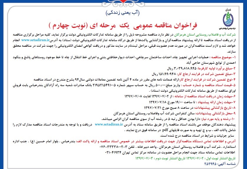شرکت آب و فاضلاب روستایی استان هرمزگان در نظر دارد مناقصه مشروحه ذیل