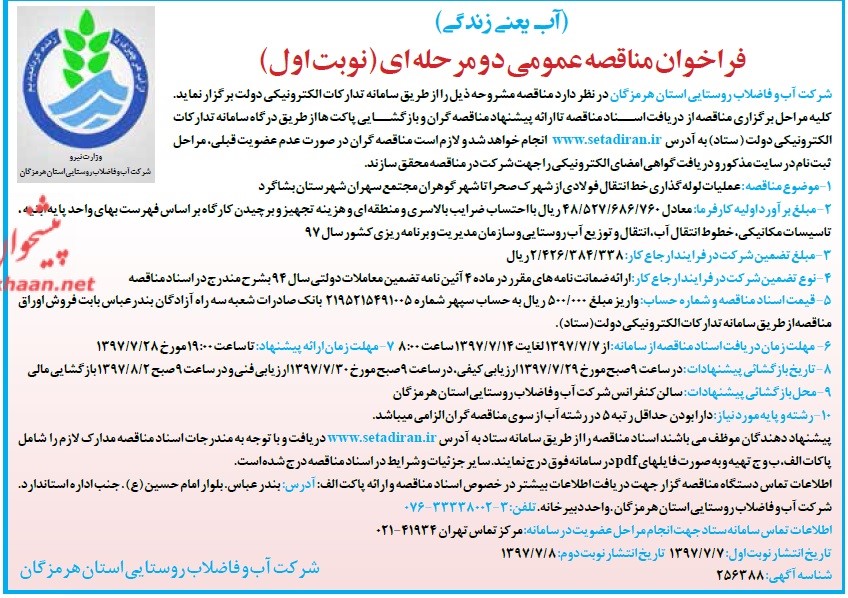 اسناد مناقصه از سامانه : از 1397/07/07 لغایت 1397/07/14 ساعت