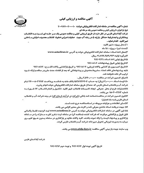 برونسپاری ارائه خدمات امداد، نگهداری و تعمیرات ، انجام خدمات پیشگیرانه شبکه های توزیع آب ، چاهها و مخازن آب و حراست فیزیکی از تاسیسات شهرستان کبودراهنگ
