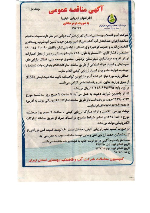 آگهی مناقصه عمومی ( فراخوان ارزیابی کیفی ) بصورت دومرحله ای نوبت اول ( 97/7) شرکت آب و فاضلاب روستایی استان تهران(شرکت دولتی) در نظر دارد نسبت به انجام مناقصه اجرای خط انتقال آب آشامیدنی از شهر بومهن جهت تأمین آب شرب روستاهای گلخندان قدیم و جدید، کردنبرد و زردستان با لوله پلی اتیلن با اقطار 90-110-125-160 میلیمتر با فشارکاری 10 اتمسفر بطول 7350 متر، شهرستان پردیس از محل اعتبارات ارزش افزوده فرمانداری شهرستان پردیس، صندوق توسعه ملی، تملک دارائیهای سرمایه ای و اسناد خزانه اسلامی از طریق سامانه تدارکات الکترونیکی دولت ( ستاد ) با توجه به شرایط مندرج در اسناد ارزیابی کیفی اقدام نماید. حداقل پایه مورد نیاز: 5 رشته آب و دارا بودن گواهینامه تأییدصلاحیت ایمنی ( HSE ) از سوی وزارت تعاون، کار و رفاه اجتماعی الزامی می باشد. برآورد پایه: 13،456،649،475 ریال می باشد. لذا از واجدین شرایط دعوت بعمل می آید تا ساعت 9 صبح روز سه شنبه مورخ 1397/07/17 جهت دریافت اسناد از طریق سامانه تدارکات الکترونیکی دولت به آدرس: www.setadiran.ir اقدام نمایند. مهلت بررسی، تکمیل و ارائه مدارک ارزیابی کیفی تا ساعت 9 صبح روز سه شنبه مورخ 1397/08/01 بر اساس شرایط مندرج در اسناد، صرفاً از طریق سامانه تدارکات الکترونیکی دولت می باشد. در صورت کسب امتیاز ارزیابی کیفی ( حداقل امتیاز 60 ) توسط کمیته فنی بازرگانی از تأییدشدگان جهت ارزیابی فنی و مالی توسط سامانه دعوت بعمل می آید. ضمناً هزینه درج آگهی در دو نوبت چاپ بعهده برنده مناقصه می باشد. کمیسیون معاملات شرکت آب و فاضلاب روستایی استان تهران |