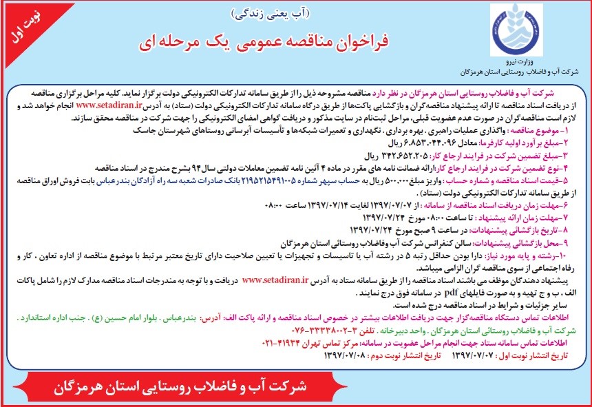 اسناد مناقصه از سامانه : از 1397/07/07 لغایت 1397/07/14 ساعت 08:00