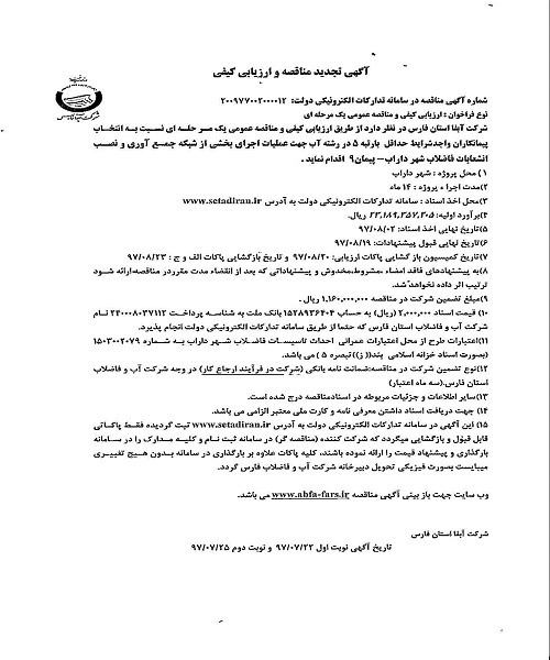 برونسپاری ارائه خدمات امداد، نگهداری و تعمیرات ، انجام خدمات پیشگیرانه شبکه های توزیع آب ، چاهها و مخازن آب و حراست فیزیکی از تاسیسات شهرستان کبودراهنگ
