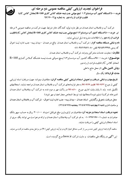 فراخوان تجدید ارزیابی کیفی مناقصه عمومی دو مرحله ای خرید25000دستگاه کنتور آب سردسایز2/ 1 اینچ مولتی جت نیمه خشک کلاس کاری R=160 (معادل کلاس C) با قابلیت قرائت از راه دور به شماره ج/2-170/97 شرکت آب و فاضلاب استان همدان در نظر دارد تولید کنندگان حائز شرایط جهت شرکت در مناقصه عمومی 2 مرحله ای خرید25000دستگاه کنتور آب سردسایز2/1 اینچ مولتی جت نیمه خشک کلاس کاری R=160 (معادل کلاس C) با قابلیت قرائت از راه دور را با اطلاعات مشروحه ذیل ارزیابی نماید. نام و نشانی دستگاه مناقصه گزار : شرکت آب و فاضلاب استان همدان واقع در همدان - میدان بیمه- جنب اداره ثبت احوال کد پستی 6515914478 تلفن 80-38219871-081 نظارت : معاونت خدمات مشترکین ودرامد شرکت آب و فاضلاب استان همدان موضوع : خرید25000دستگاه کنتور آب سردسایز2/1 اینچ مولتی جت نیمه خشک کلاس کاری R=160 (معادل کلاس C) با قابلیت قرائت از راه دور روش تامین مالی :از محل منابع داخلی مدت قرارداد: یک سال تاریخ،مهلت و نشانی دریافت و تحویل استعلام ارزیابی کیفی مناقصه گران:: متقاضیان میتوانند جهت دریافت اسناد ارزیابی کیفی از مورخ 22/07/97 لغایت 26/07/97 به دفتر قراردادهای شرکت آب و فاضلاب استان همدان مراجعه نمایند. استعلامهای تکمیل شده باید تا پایان وقت اداری مورخ 10/08/97 در پاکت مهر و موم شده به شرکت آب وفاضلاب استان همدان (دبیرخانه شرکت) تسلیم شود.(استعلامها باید توسط اشخاص مجاز امضا و مهر شوند) محل دریافت ،تحویل وگشایش اسناد: همدان - میدان بیمه- جنب اداره ثبت احوال- شرکت آب و فاضلاب استان همدان و ساعت اداری (شنبه تا چهارشنبه 7:45 تا 14:15 ،پنجشنبه 7:45 تا 13:15) نحوه دریافت اسناد استعلام و هزینه آن: متقاضیان در ازای واریز مبلغ غیرقابل استرداد 000/300 ریال به حساب سپهر بانک صادرات به شماره 0101396197001 به نام شرکت آب وفاضلاب استان همدان و ارائه درخواست می توانند یک سری از اسناد استعلام ارزیابی کیفی را دریافت نمایند. مناقصه گران ابتدا ارزیابی کیفی شده و پس از کسب حداقل امتیاز لازم در فرآیند ارزیابی کیفی(70) در مراحل بعدی مناقصه شرکت می نمایند. این آگهی در پایگاه ملی مناقصات و سایت شرکت hww.ir درج گردیده است. |