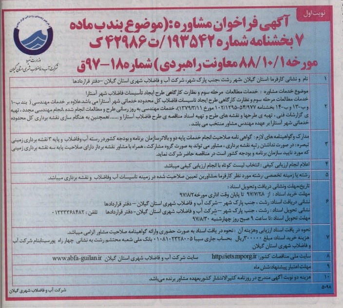 | 8 | سایت ملی مناقصات کشور: http://iets.mporg.ir سایت شرکت آب و فاضلاب شهری استان گیلان www.abfa-guilan.ir |