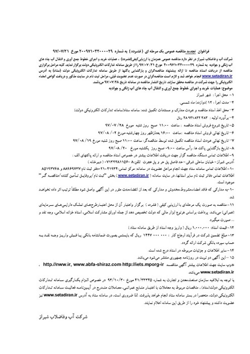 برونسپاری ارائه خدمات امداد، نگهداری و تعمیرات ، انجام خدمات پیشگیرانه شبکه های توزیع آب ، چاهها و مخازن آب و حراست فیزیکی از تاسیسات شهرستان کبودراهنگ