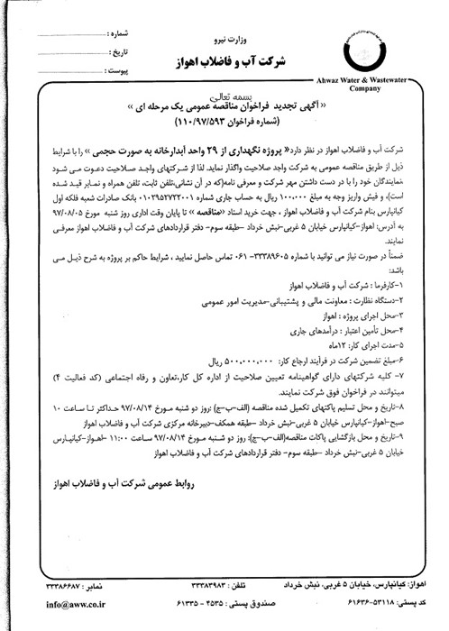 ‹‹ آگهی تجدید فراخوان مناقصه عمومی یک مرحله ای ›› (شماره فراخوان 593/97/110) شرکت آب و فاضلاب اهواز در نظر دارد« پروژه نگهداری از 29 واحد آبدارخانه به صورت حجمی ›› را با شرایط ذیل از طریق مناقصه عمومی به شرکت واجد صلاحیت واگذار نماید. لذا از شرکتهای واجد صلاحیت دعوت می شود ،نمایندگان خود را با در دست داشتن مهر شرکت و معرفی نامه(که در آن نشانی،تلفن ثابت، تلفن همراه و نمابر قید شده است)، و فیش واریز وجه به مبلغ 100،000 ریال به حساب جاری شماره 0102952722001 بانک صادرات شعبه فلکه اول کیانپارس بنام شرکت آب و فاضلاب اهواز ، جهت خرید اسناد ‹‹مناقصه ›› تا پایان وقت اداری روز شنبه مورخ 05/08/97 به آدرس: اهواز-کیانپارس خیابان 5 غربی-نبش خرداد –طبقه سوم- دفتر قراردادهای شرکت آب و فاضلاب اهواز معرفی نمایند. ضمناً در صورت نیاز می توانید با شماره 33389605- 061 تماس حاصل نمایید ، شرایط حاکم بر پروژه به شرح ذیل می باشد: 1-کارفرما : شرکت آب و فاضلاب اهواز 2-دستگاه نظارت : معاونت مالی و پشتیبانی-مدیریت امور عمومی 3-محل اجرای پروژه : اهواز 4-محل تأمین اعتبار : درآمدهای جاری 5-مدت اجرای کار: 12ماه 6-مبلغ تضمین شرکت در فرآیند ارجاع کار: 500،000،000 ریال 7- کلیه شرکتهای دارای گواهینامه تعیین صلاحیت از اداره کل کار،تعاون و رفاه اجتماعی (کد فعالیت 4) میتوانند در فراخوان فوق شرکت نمایند. 8-تاریخ و محل تسلیم پاکتهای تکمیل شده مناقصه (الف-ب-ج) :روز دو شنبه مورخ 14/08/97 حداکثر تا ساعت 10 صبح-اهواز-کیانپارس خیابان 5 غربی-نبش خرداد –طبقه همکف-دبیرخانه مرکزی شرکت آب و فاضلاب اهواز 9-تاریخ و محل بازگشایی پاکات مناقصه(الف-ب-ج): روز دو شنبه مورخ 14/08/97 ساعت 11:00 -اهواز-کیانپارس خیابان 5 غربی-نبش خرداد –طبقه سوم- دفتر قراردادهای شرکت آب و فاضلاب اهواز