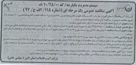 خرید 54 دستگاه فلومترالکترومغناطیسی 150 میلیمتر و 1 دستگاه فلومتر الکترومغناطیسی 200 میلیمتر/ آبفا استان البرز