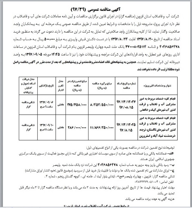 گروه مناقصات شرکت آبفای قزوین