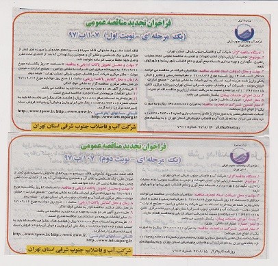 3. مهلت و محل دریافت اسناد تجدید مناقصه: متقاضیان شرکت در مناقصه می توانند حداکثر تا ساعت 14 روز شنبه مورخ 26/08/97 با معرفینامه رسمی و معتبر و فیش بانکی واریز شده هزینه خرید اسناد به این شرکت به نشانی ورامین – مجتمع ادارات – خیابان دولت – شرکت آب و فاضلاب جنوب شرقی استان تهران دبیرخانه مرکزی تلفن: 36270015 – 021 مراجعه و نسبت به دریافت اسناد ارزیابی و مناقصه اقدام نمایند.