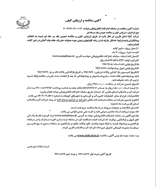 برونسپاری ارائه خدمات امداد، نگهداری و تعمیرات ، انجام خدمات پیشگیرانه شبکه های توزیع آب ، چاهها و مخازن آب و حراست فیزیکی از تاسیسات شهرستان کبودراهنگ