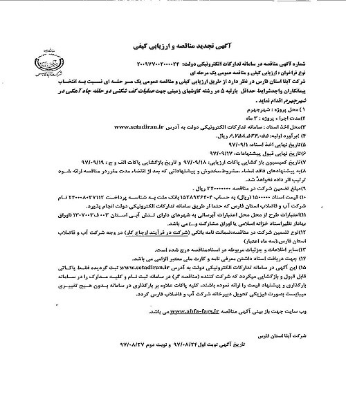برونسپاری ارائه خدمات امداد، نگهداری و تعمیرات ، انجام خدمات پیشگیرانه شبکه های توزیع آب ، چاهها و مخازن آب و حراست فیزیکی از تاسیسات شهرستان کبودراهنگ