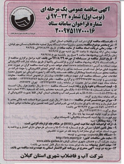 | آگهی مناقصه عمومی یک مرحله ای (نوبت اول) شماره 22-97ق شماره فراخوان سامانه ستاد :20097511700016 |